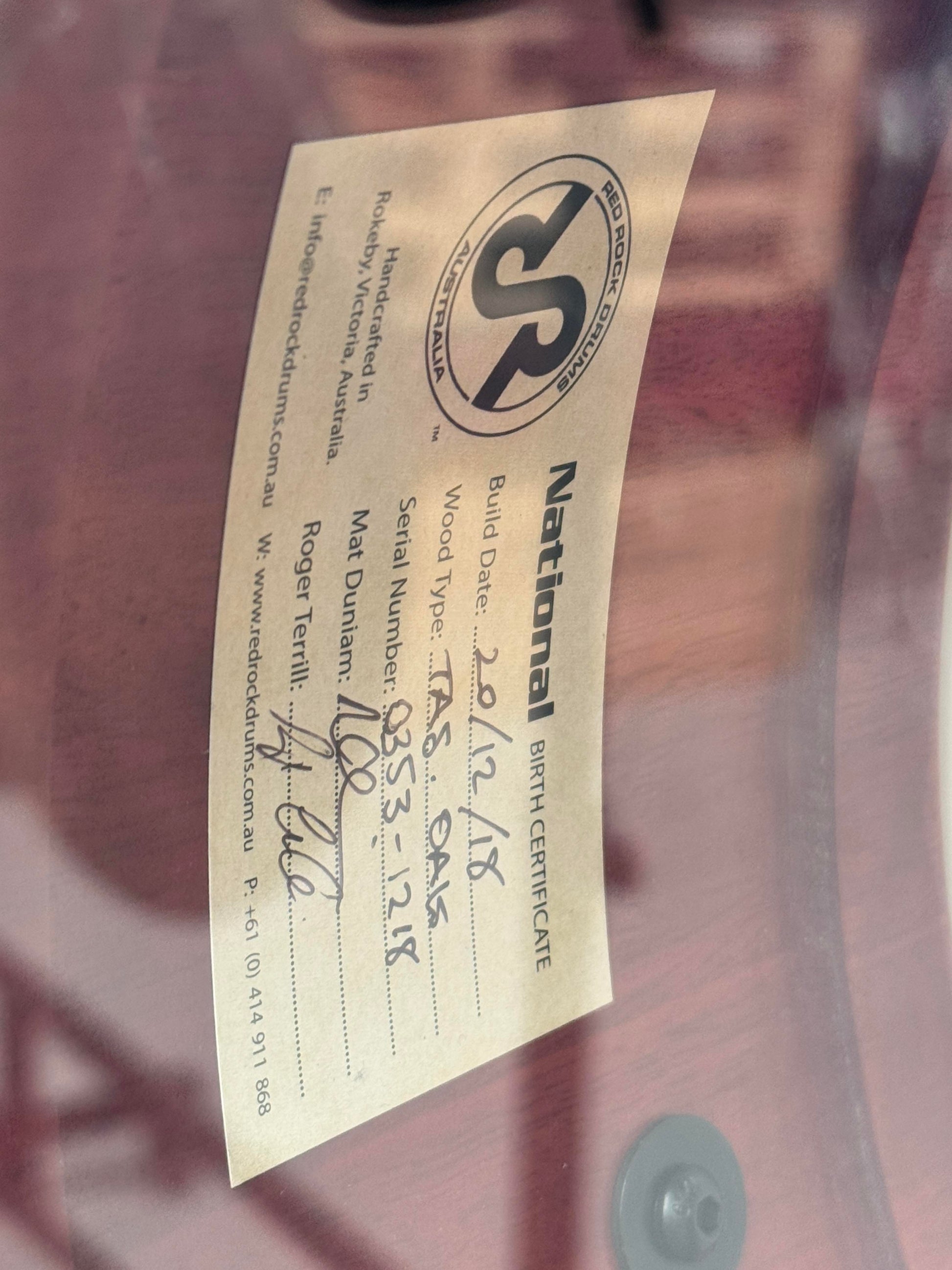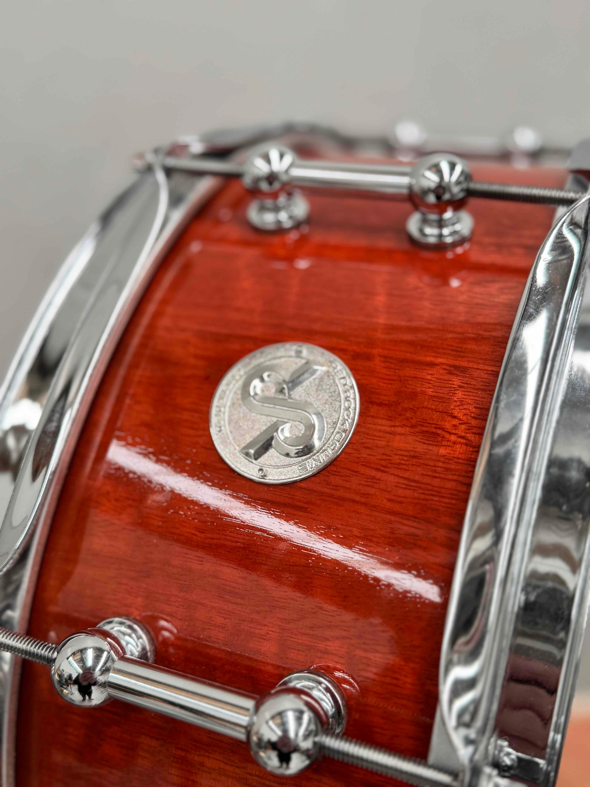 This a one of a kind gloss burnt orange wood grain finish 14.5.5" Stave Tassie Oak Snare built for Red Cymbals by Red Rock Drums Australia.